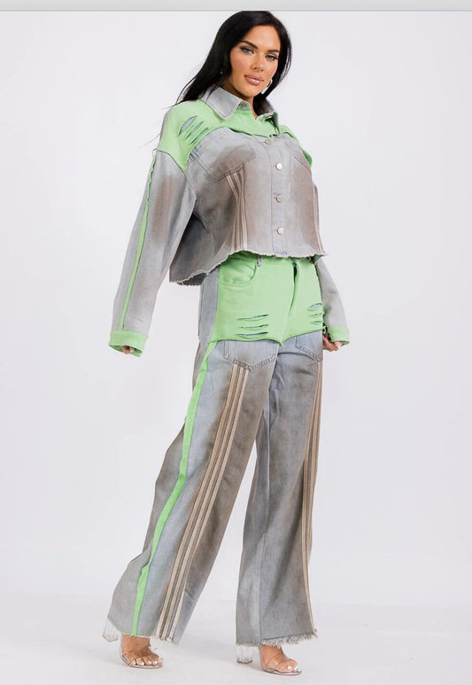 LONG SLEEVE JACKET & WIDE LEG PANTS COLORBLOCK DENIM 2PC. SET