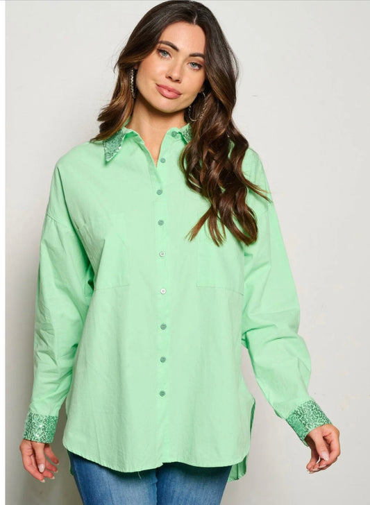 LONG SLEEVE BUTTON UP SEQUINS GRAPHIC BLOUSE TOP